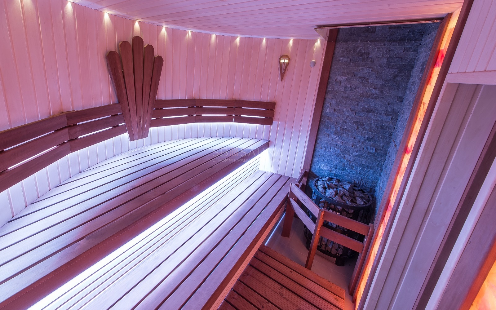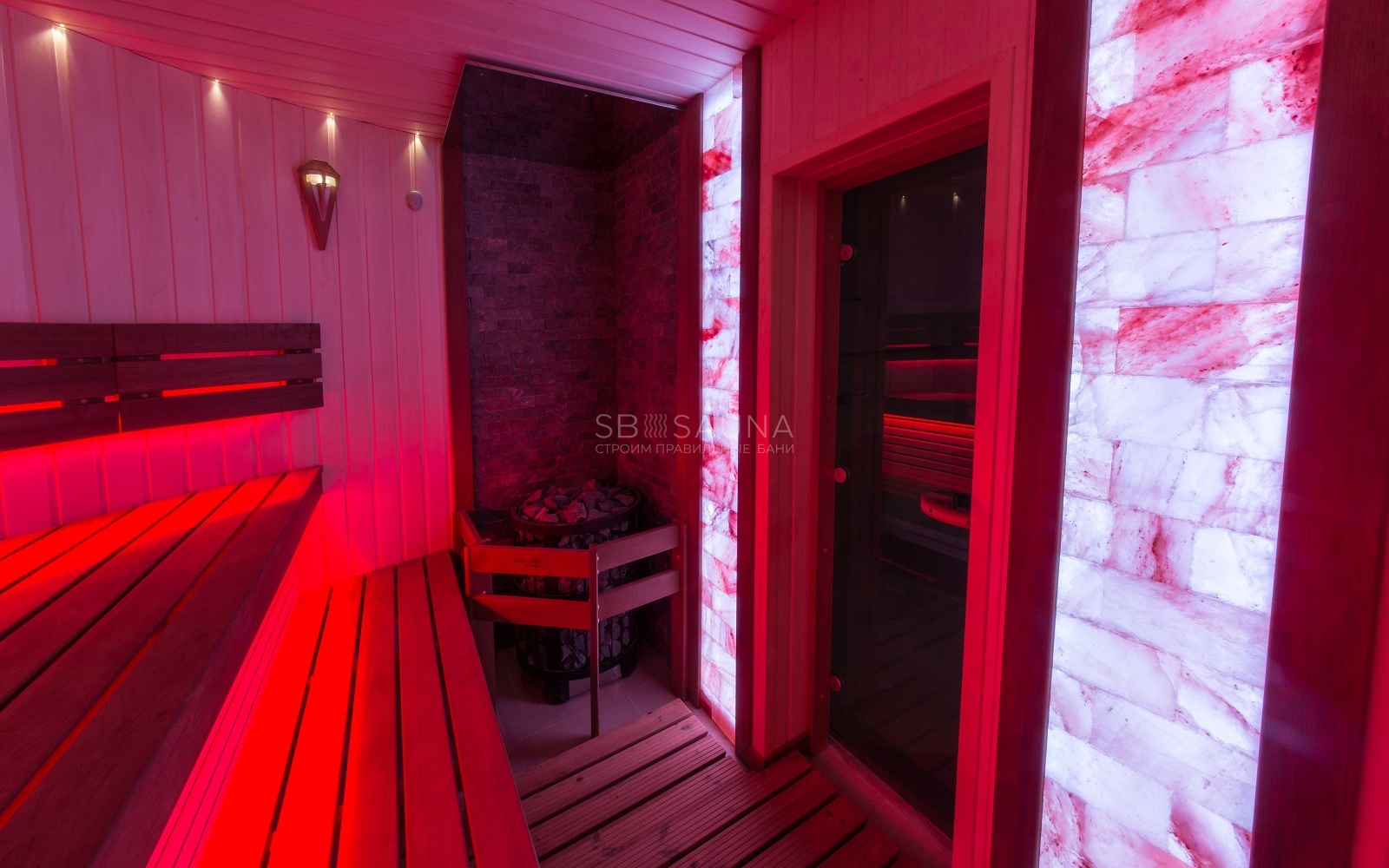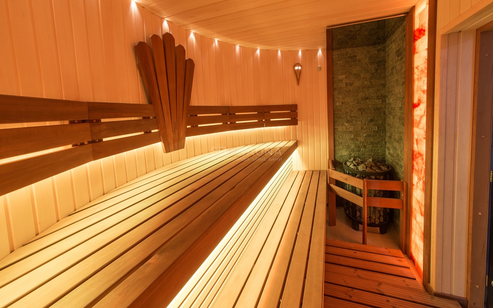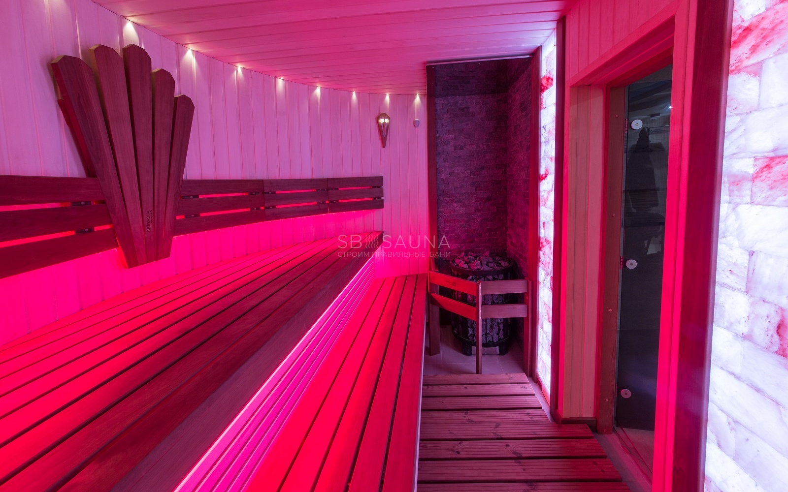 Для декора заказчик остановился на панно из гималайской соли, что стало ярким важным акцентом в дизайне данной сауны.