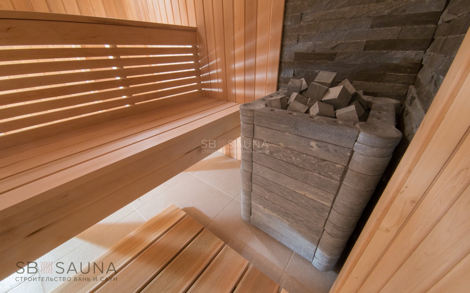 При проектировании парной важно подобрать правильную печь. Для данной финской сауны мы остановились на печи Nimbus в обкладке из талькохлорита от компании Sawo.Специально для этой печи были подобраны натуральные камни - пиленный талькохлорит