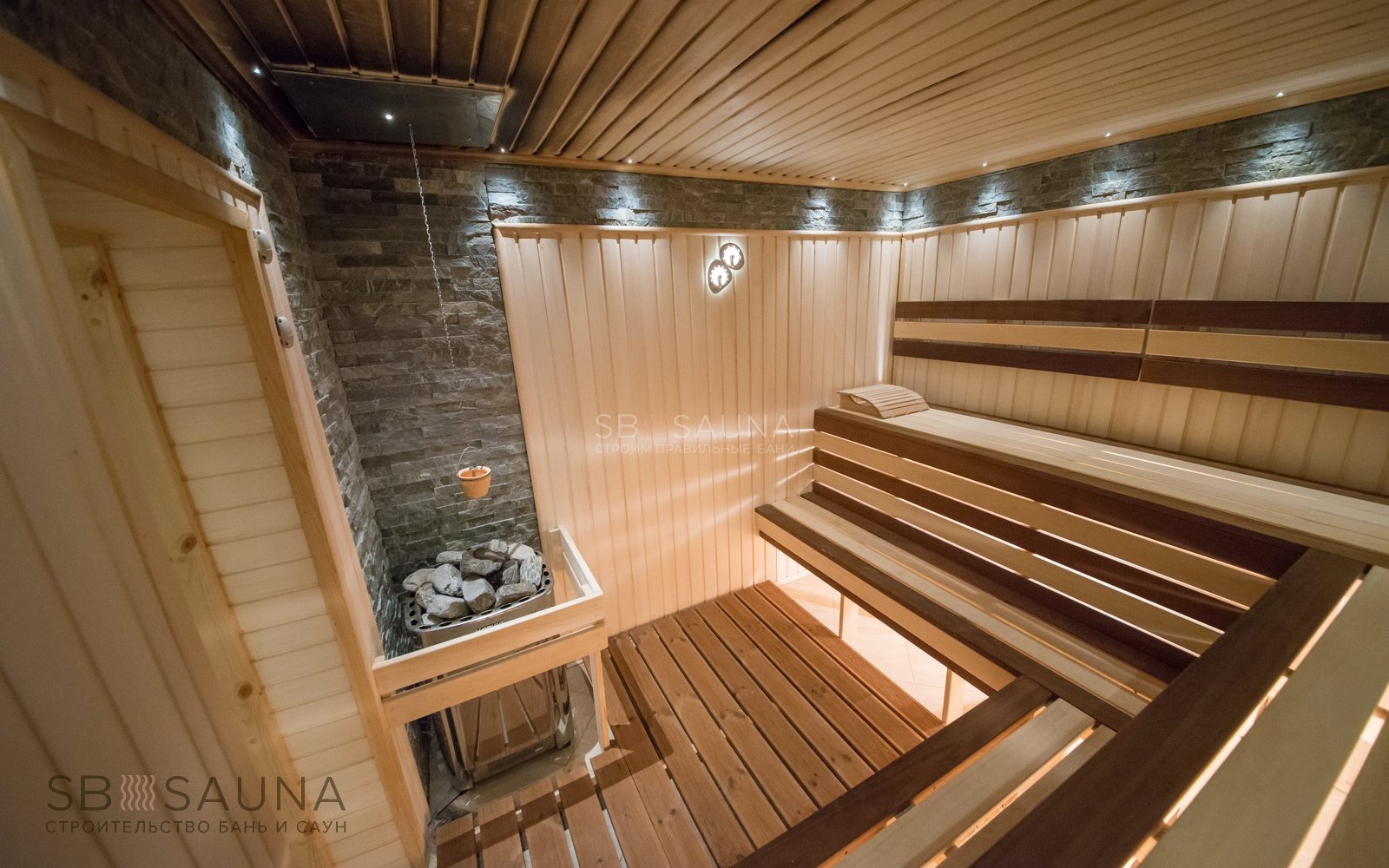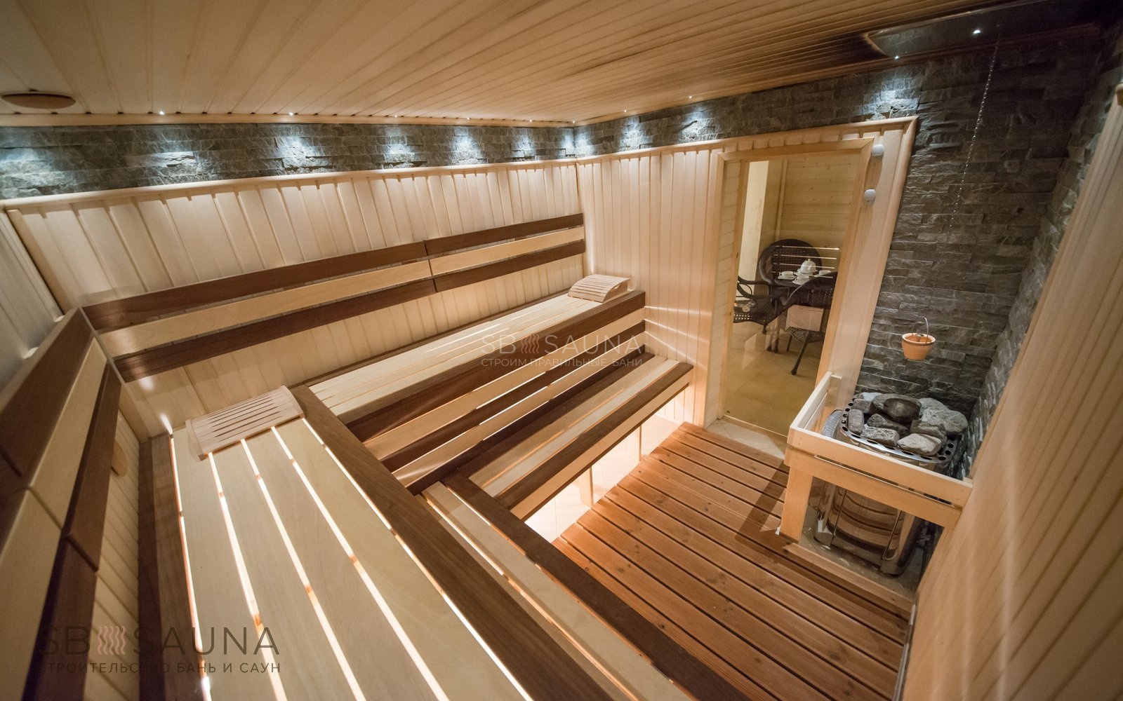 Для отделки мы выбрали талькохлорит - природный строительный и декоративный камень, а также вагонку из липы и африканский абаш/ термоабаш для потолка